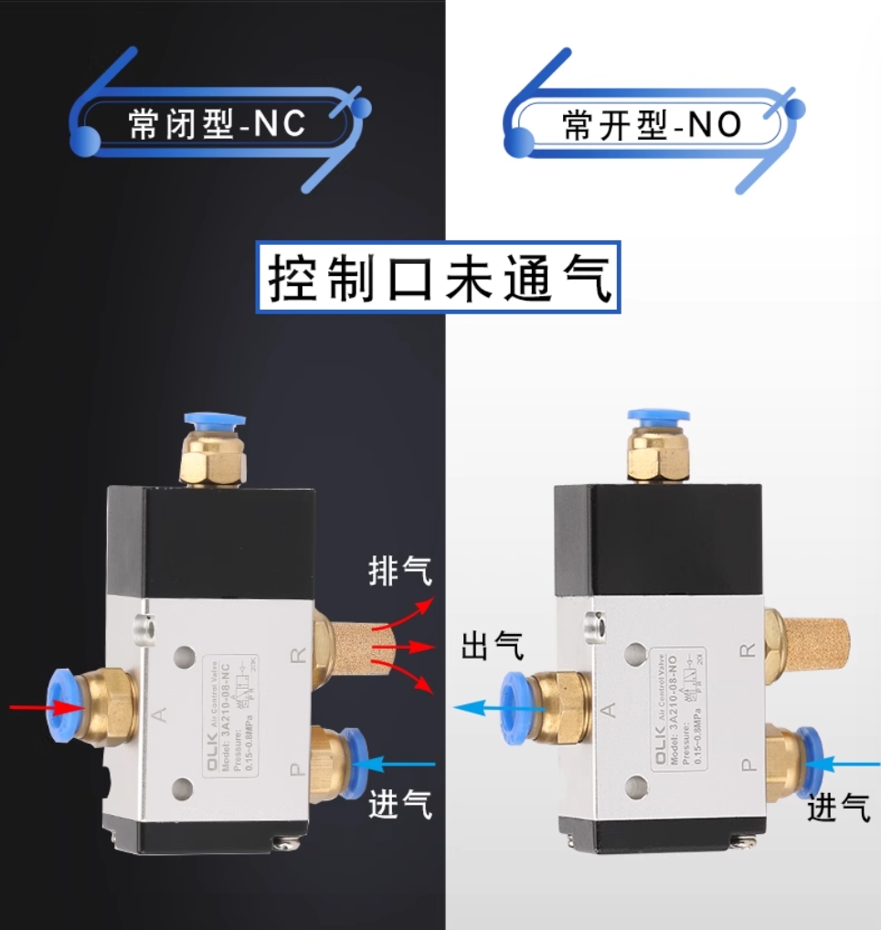 NC (de ghnáth dúnta): tá an comhla dúnta nuair nach bhfuil aon aer ann, agus ní féidir é a oscailt ach amháin tar éis a bheith tiomáinte ag brú comhartha / aeir.