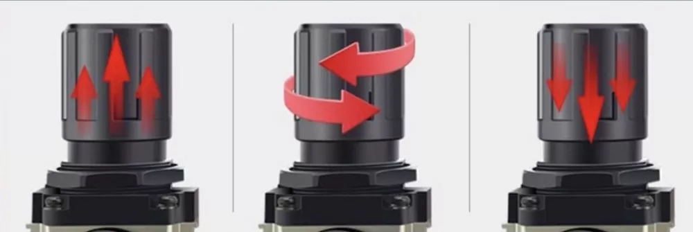 Tá scála brú ar an gcaipín coigeartaithe. Nuair a sholáthraítear aer, tarraing suas an cnag agus cas deiseal é i dtreo an chomhartha “+” chun an brú a mhéadú. Tar éis coigeartú, brúigh an knob síos chun é a ghlasáil.