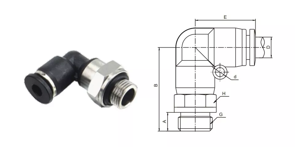 Is cónascaire uillinn 90-céim é an brú uillinn fireann pl-g i bhfeistiú feadán feadán agus is é atá i gceist le snáithe G atá idéalach le húsáid i spásanna teoranta nó i gcás ina bhfuil gá le hatreorú feadánra.