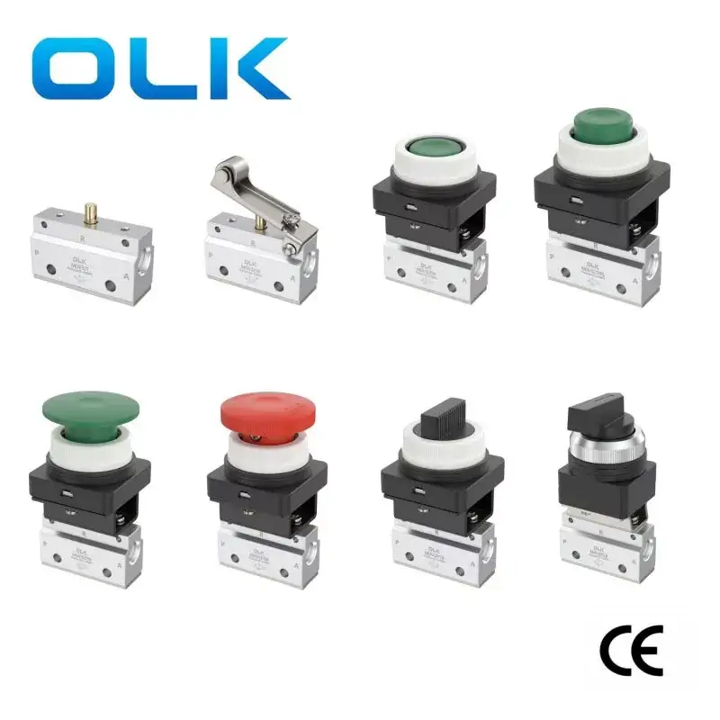 OULEIKAI (OLK) Sraith VM Tá comhlaí cnaipe meicniúla SMC ar fáil in dhá chineál feidhme: 2-suíomh 2-bhealach agus 2-suíomh 3-bhealach. Tagann na calafoirt ionraoin agus asraonta aeir in dhá chineál comhéadan: taobh agus bun. I measc na méideanna snáithe do na calafoirt tá M5, G1/8, agus PT1/4.